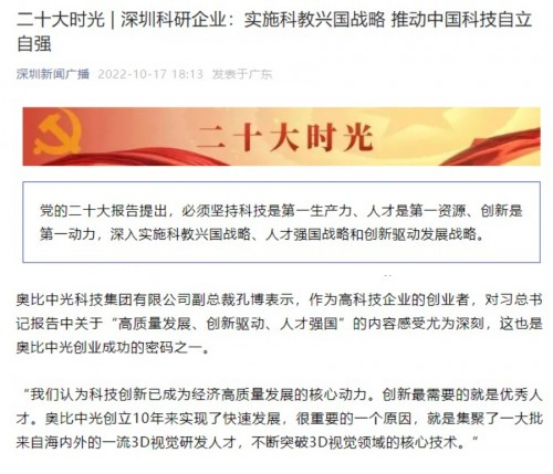 图注:10月17日,深圳新闻广播二十大专题报道将奥比中光作为科技自立自强代表。