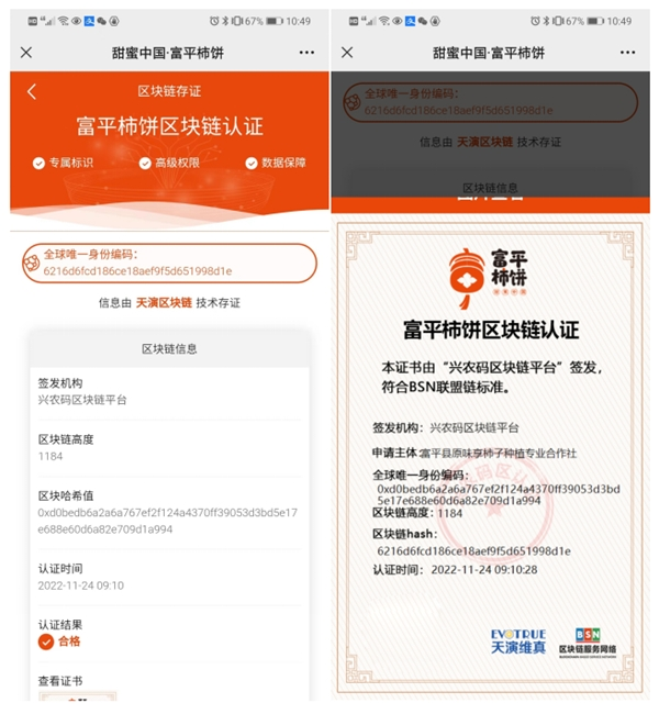 为确保“富平柿饼”生产全程数字化,天演维真对21道手工工序进行实时数字取证,依托区块链技术去中心化、不可篡改的特性,把“富平柿饼”从霜降长成到出品销售的21个环节信息全部实时上链,用对应的时间戳证明数据真实,防止被恶意篡改和删除,为消费者提供全透明的柿饼质量把关,提升消费信心,构建消费信任。