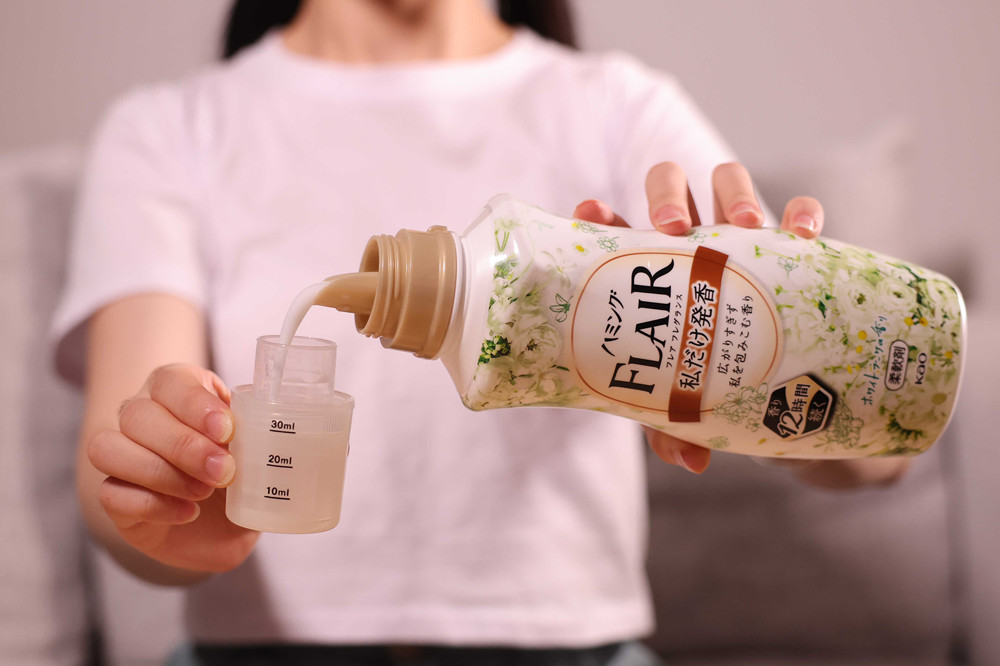 日常衣物洗护则可搭配同款香型——“Flair Fragrance”花王衣物柔顺剂(白桃茉莉香),衣物洗后柔软舒适的同时,还能持久留香12小时*。两款产品都蕴含释香成分,淡雅的白桃茉莉香柔和沁心,双重衣物呵护,让你仿若置身于花园般,感受清新气息。(* 在规定实验条件下,本品在织物上的留香时长约12小时。)