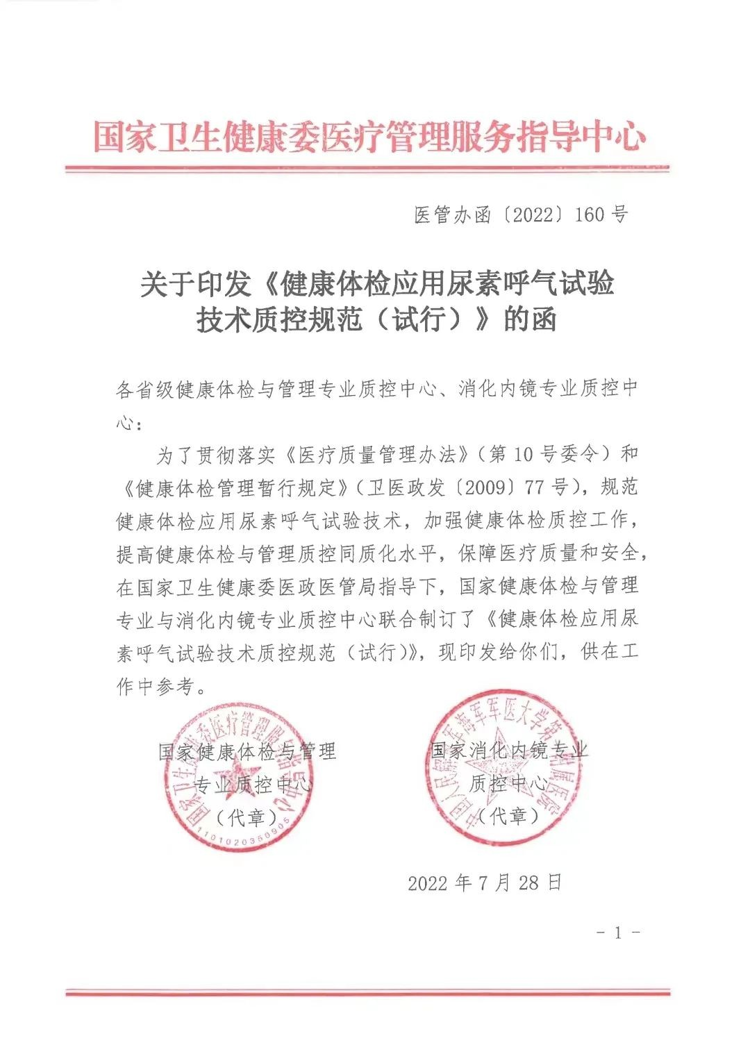 近日,国家健康体检与管理专业与消化内镜专业质控中心联合制定印发《健康体检应用尿素呼气试验技术质控规范(试行)》。