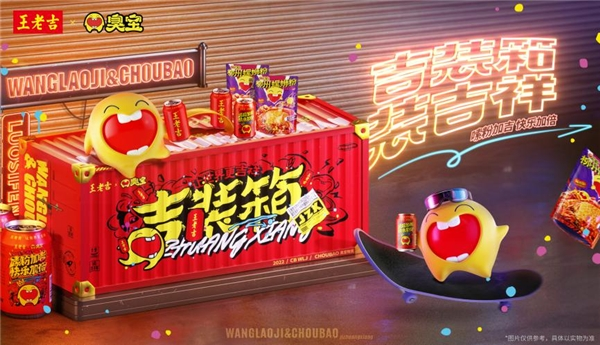 双方推出王老吉×臭宝吉装箱联名礼盒,包含各自的明星产品:王老吉红罐凉茶与臭宝爆爆浓汤柳州螺蛳粉,其中凉茶罐身采用联名定制设计。礼盒取意“吉装箱,装吉祥”,大胆采用仿集装箱的炫酷外形,提取王老吉经典的红黄配色,元素上既有臭宝的萌趣IP形象,也包含王老吉的“吉文化”符号,营造欢乐喜庆的氛围的同时,传递好运吉祥寓意,打开年轻人聚会的大门,满足其有颜有趣有个性的需求。