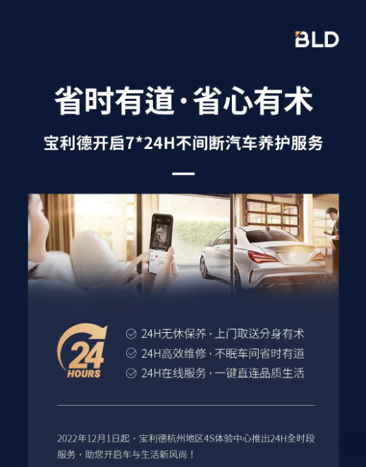12月1日,宝利德集团宣布在杭州推出全国首个7X24H全时段服务模式,打破传统修车服务在时间、效率、地点方面的局限,打造豪华车领域服务的新标杆。宝利德集团杭州体验中心已开启提供包括24小时上门取送、夜间维修、在线服务等7X24H不间断的汽车养护服务,让杭州豪华车主更省时、省心、省力地用车、养车。