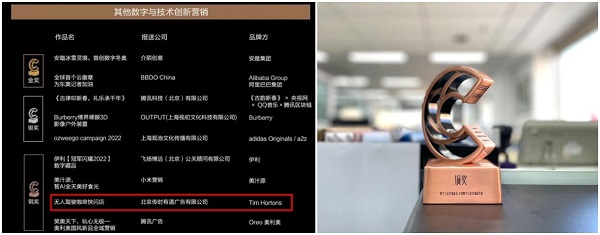 2022年11月17日,金瞳奖公布2022获奖名单。北京传时有道广告有限公司(以下简称传时互动)报送的Tims咖啡X百度智能驾驶创新营销活动 “无人驾驶咖啡快闪店”,荣获未来板块数字与技术创新组铜奖。