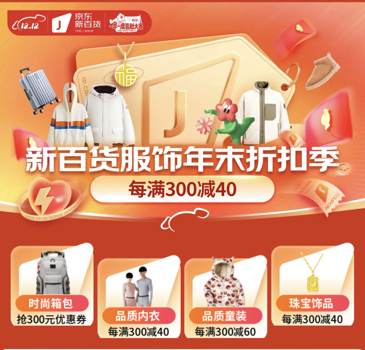 京东新百货12.12服饰年末折扣季活动已全面开启,集结大牌爆品、新品、定制服饰等暖冬衣物,让冬装高效省心购。同时兼顾节日礼赠等需求,以每满300减40、大牌不止5折、实付满赠等多重福利诚意回馈消费者。京东新百货,总能选到中意的!