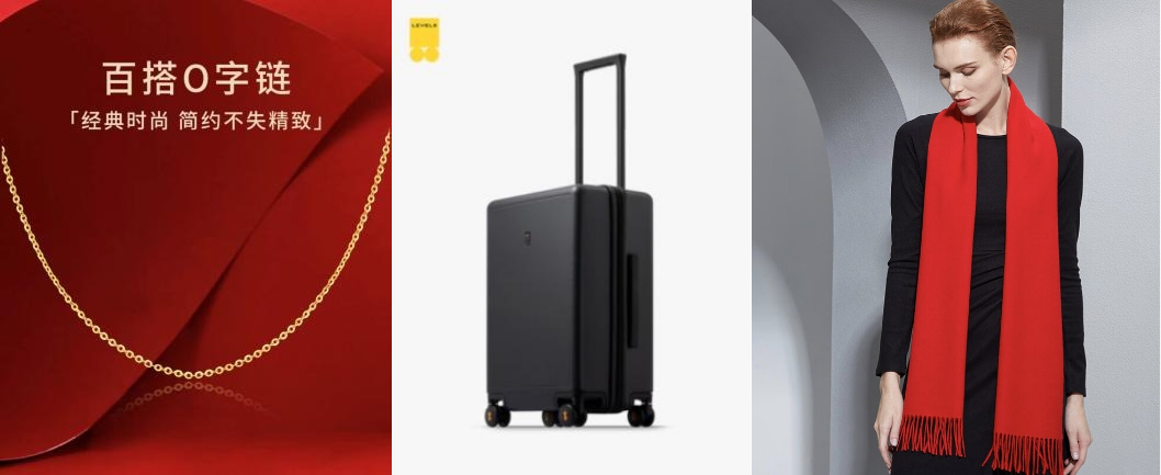 亚一珠宝黄金素链、地平线8号行李箱、恒源祥羊毛大红围巾