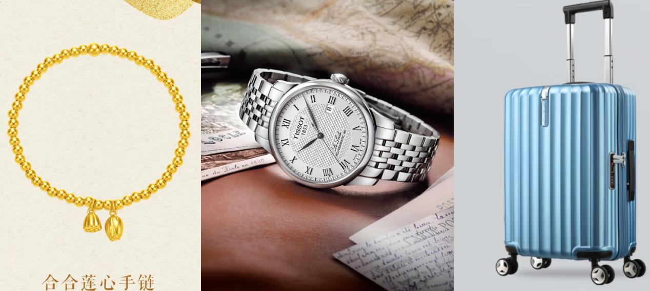 周大福传承莲子莲蓬手链、天梭钢带力洛克机械男表、新秀丽时尚潮流拉杆箱