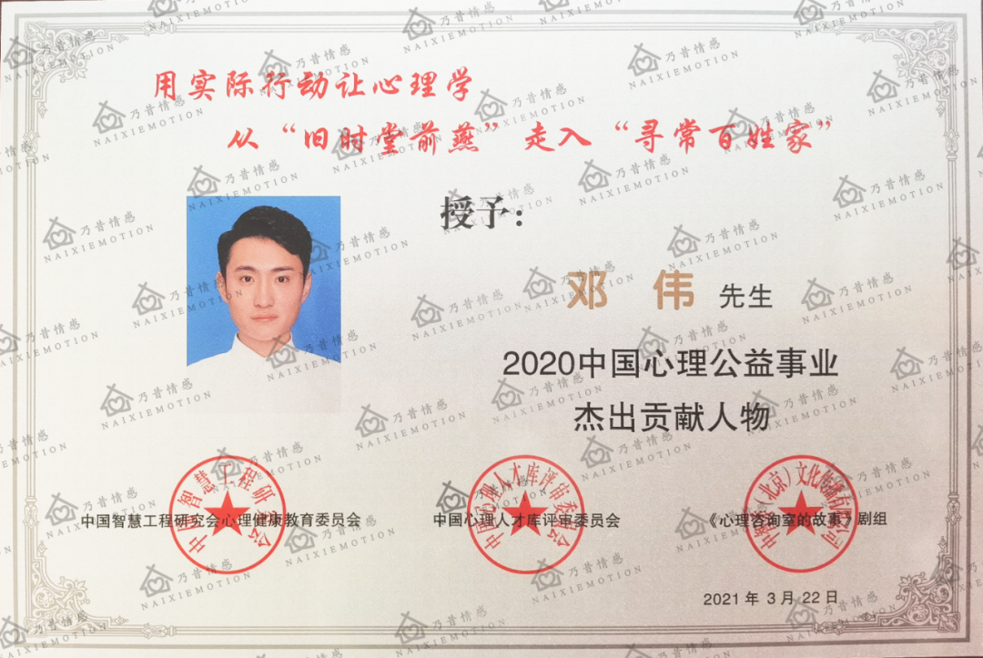 我个人也十分有幸,2019年被载入《中国心理工作者人才库》,并受邀担任中国首部百集心理电视连续剧《心理咨询室的故事》心理技术顾问;2020年被授予“2020中国心理公益事业杰出贡献人物”荣誉称号;2021年受邀担任京东健康频道特别嘉宾......