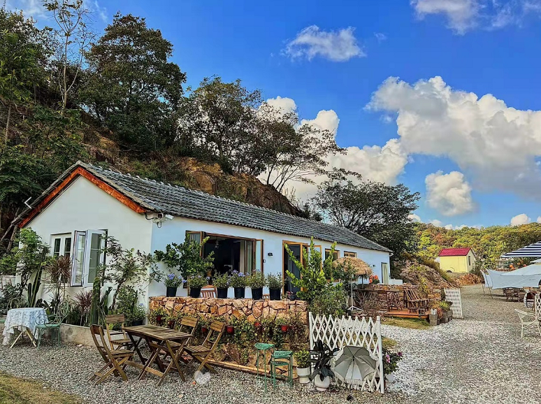 利用废弃矿山盘活再利用的位于道场浜村的南麓别院,主体的房子之前是一个破旧的羊圈,经过“微改造、精提升”后,变成现在的室内咖啡馆,根据自然的山体和水域进行巧妙的造景,营造海边的度假氛围,深受客人欢迎。