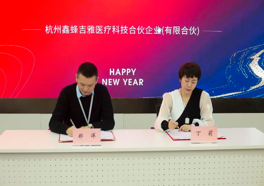 吉雅其的创始人郑洋先生与鑫蜂维投资总监同时也是鑫蜂吉雅医疗的基金管理员丁莉女士共同出席签约仪式。