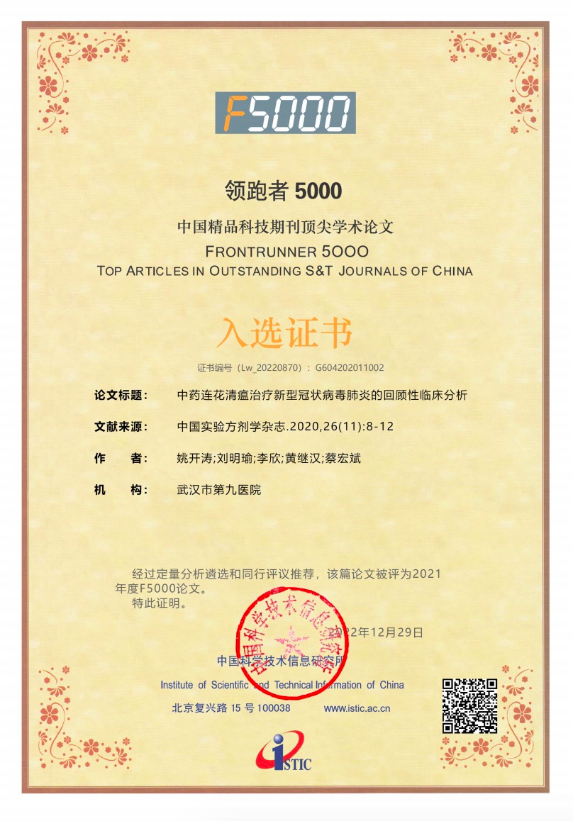 日前,科技部中国科技信息研究所发布了2021年度“领跑者5000——中国精品科技期刊顶尖学术论文(F5000)”入选名单。武汉市第九医院研究论文《中药连花清瘟治疗新型冠状病毒感染的肺炎回顾性临床分析》(姚开涛,刘明瑜,李欣,黄继汉,蔡宏斌)成功入选,体现了该研究成果在国内的高影响力和学术价值。