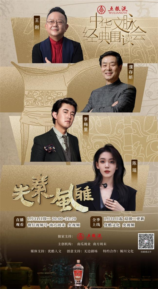 1月31日,由五粮液独家支持、南方周末与南瓜视业联合打造的《中华文脉·经典围读会》第一场“先秦风雅”已于南方周末、央视频,优酷视频上线。四位演艺名家:濮存昕、王刚、陈瑶、李梅里,与学者止庵、孟宪实,共同围读“中国之情”“中国之宴”“中国之道”“中国之梦”,探寻中华文脉之源、中华民族的智慧之根。