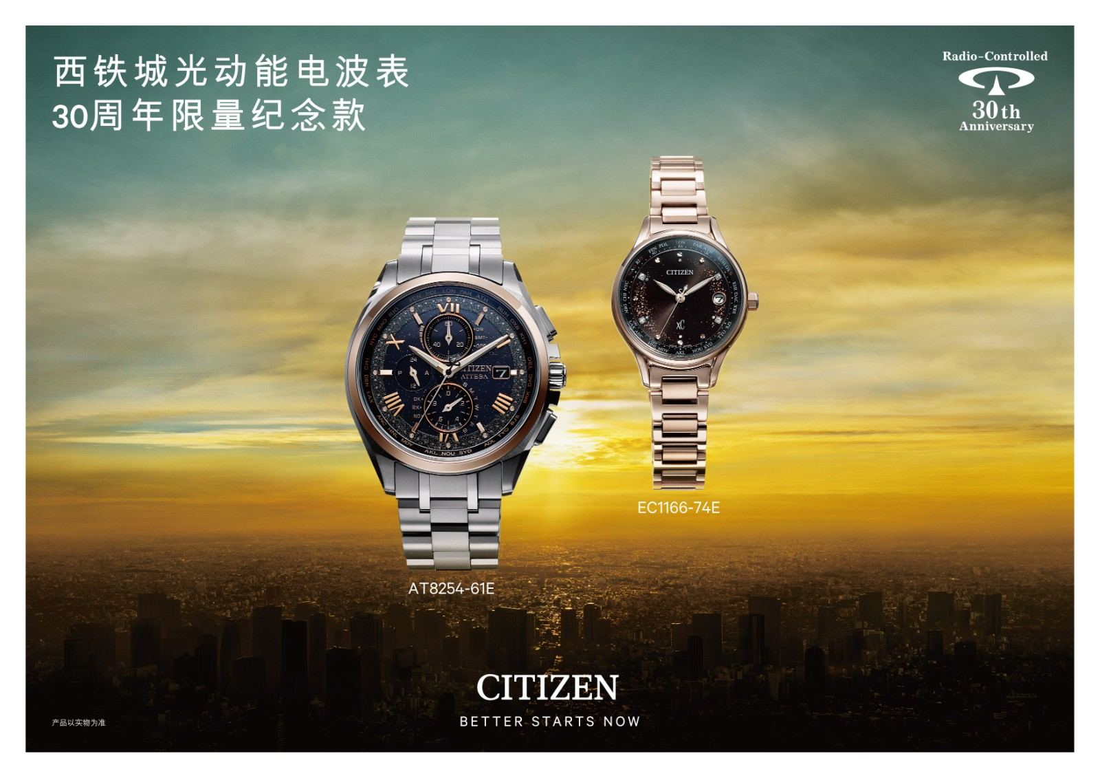 两款腕表均搭载西铁城光动能全球多局电波机芯,无需手动校时,时刻掌握准确时间。光动能吸收可见光转化为电能带动腕表持续运转,无需频繁更换电池,环保安心。除此之外,腕表还具备Perfex性能,将防磁、撞击侦测、指针自动修正等人性化功能融为一体,强大的功能带来更精准、高效的计时体验。光动能电波表30周年限量纪念款,承袭了西铁城百余年的品牌初心与制表技艺,将西铁城一直以来秉承的Better Starts Now品牌理念幻化成具体的腕间臻品,创造了别具现代设计与技术魅力的专属体验,连结过去的辉煌成就,开启未来的无限曙光。