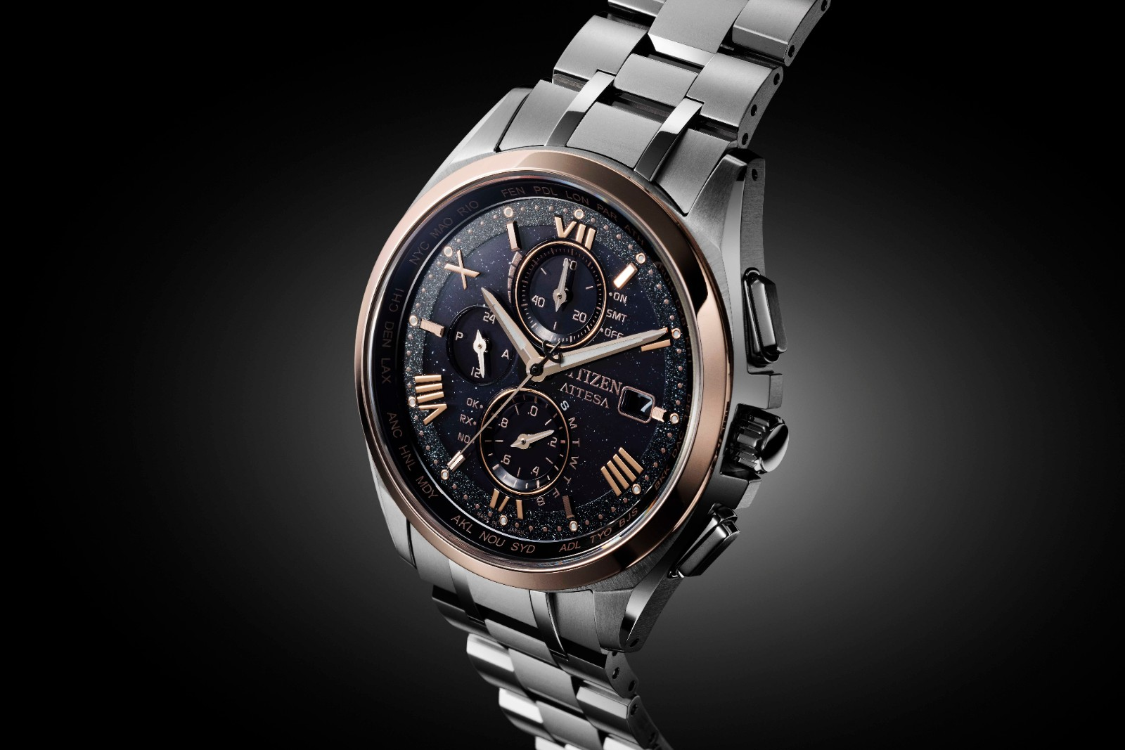 男款腕表AT8254-61E,以庆祝全新开始的“黎明”时刻作为设计主题,以华丽优雅、闪烁耀眼的樱花粉色表圈及金色罗马时标、指针等表现出来。与醒目的黑色闪金表盘形成鲜明对比的时标和指针,让人感受到黎明之光的强烈。三眼表盘繁简相宜,黑金两色相间,格局大方奢华。12点位小表盘为分钟计时盘、夏令时指示和剩余电量等级显示;6点位功能盘兼顾1/20秒针计时、星期显示和电波信号接收结果显示;9点位表盘是24小时指示。日历视窗、黑色内色内影圈上26个世界城市名称缩写等和谐分布其中。时针、分针采用发光涂层处理,确保黑暗条件下极佳的可视性。41毫米直径的舒博™钛表壳和经过精心打磨的表带,轻盈舒适更具豪迈动感和精致奢华。