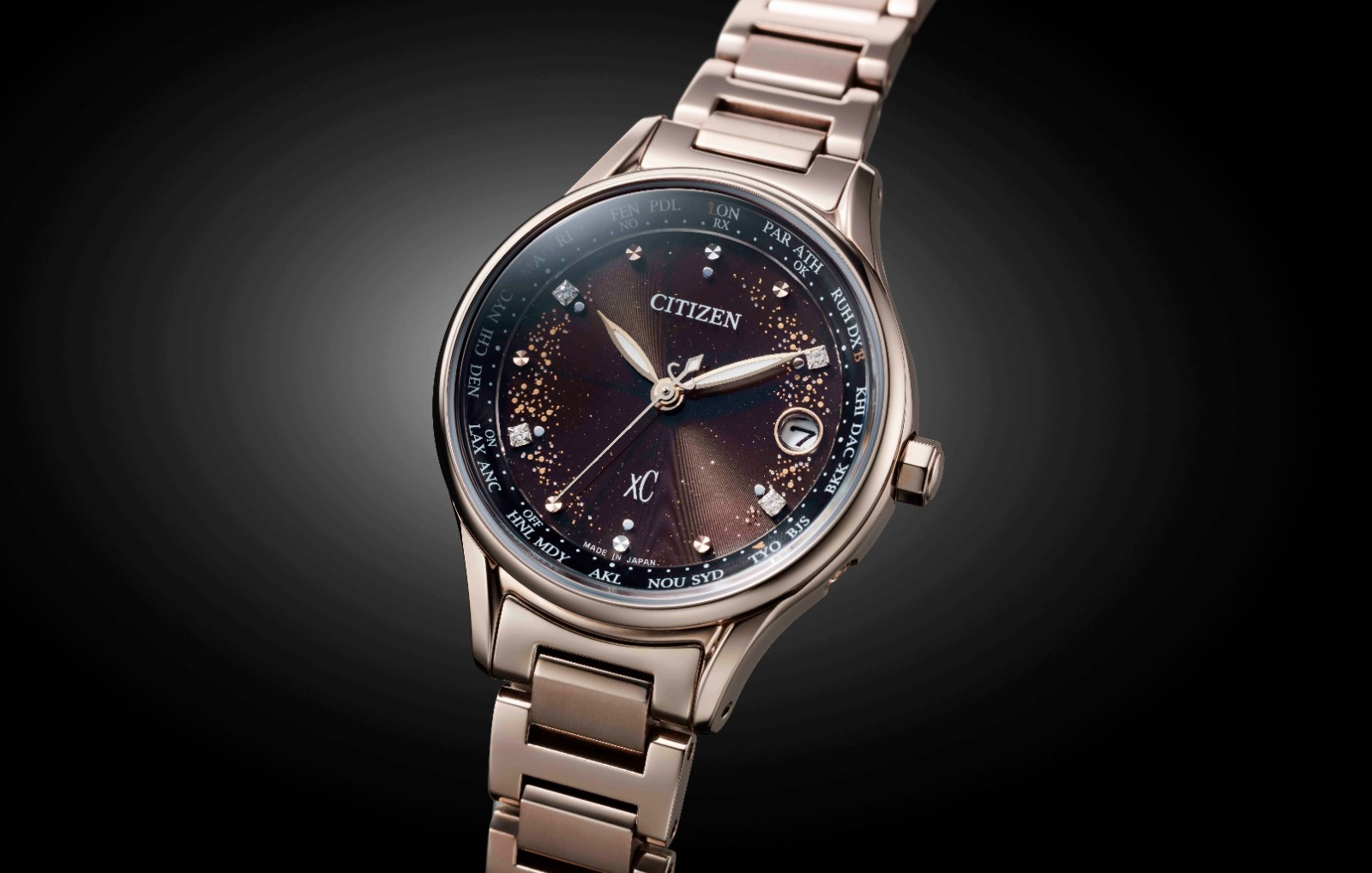 女款腕表EC1166-74E,在视觉上奢华精致之感更为明显。闪闪发光的金粉装饰,表现了晨曦时分的光耀粒子。金银两色圆点时标间饰4颗方形实验室培育钻石,璀璨的光芒作为此限定纪念款女表独有的瑰丽设计。内影圈排布24个世界城市名称缩写,东京位置一颗红色心之印记再添巧思。樱花粉金色表壳表带,保留金属光泽和质感的同时彰显奢华耀目的高贵气质。蓝宝石玻璃表镜通透性十足,防反射涂层工艺确保不同角度赏读时都无需担心反光困扰。西铁城特有的舒博™钛材质,轻盈、亲肤、耐磨损、抗锈蚀,冬日佩戴也无激冷感,随时随地贴心陪伴。