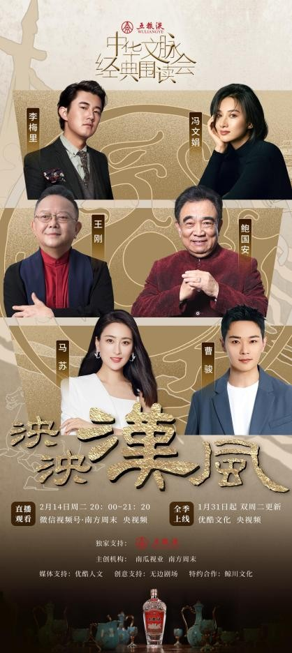 2月14日,由五粮液独家支持、南方周末与南瓜视业联合打造的《中华文脉·经典围读会》第二场“泱泱汉风”已于南方周末、央视频、优酷同步上线。七位演艺名家:鲍国安、王刚、马苏、冯文娟、曹骏、胡乐民、李梅里,与学者止庵、孟宪实、向阳,共同围读《史记》、乐府、汉赋与《古诗十九首》,致敬文学中国先贤,探寻文字的力量,聆听内心的声音。
