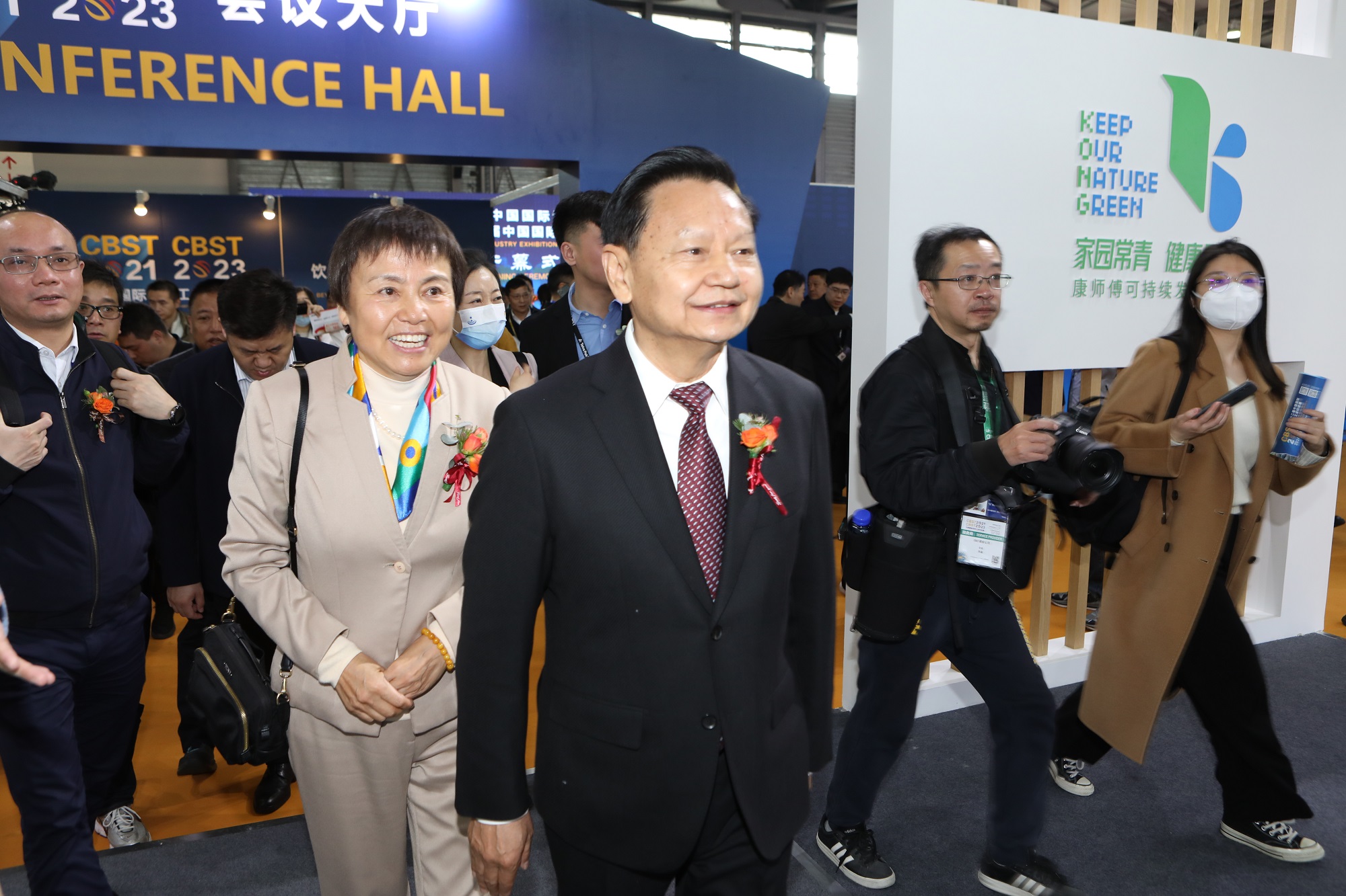 中国轻工业联合会会长张崇和和中国饮料工业协会名誉理事长赵亚利参观康师傅饮品展区