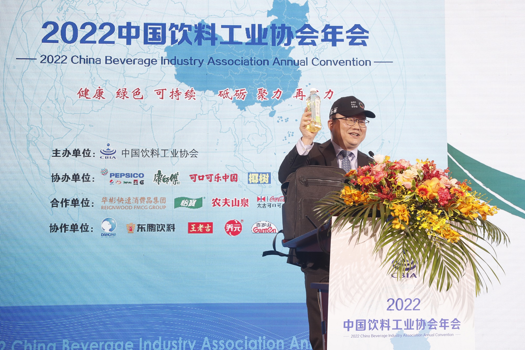 康师傅控股有限公司行政总裁陈应让在中国饮料工业协会年会上展示康师傅低碳产品