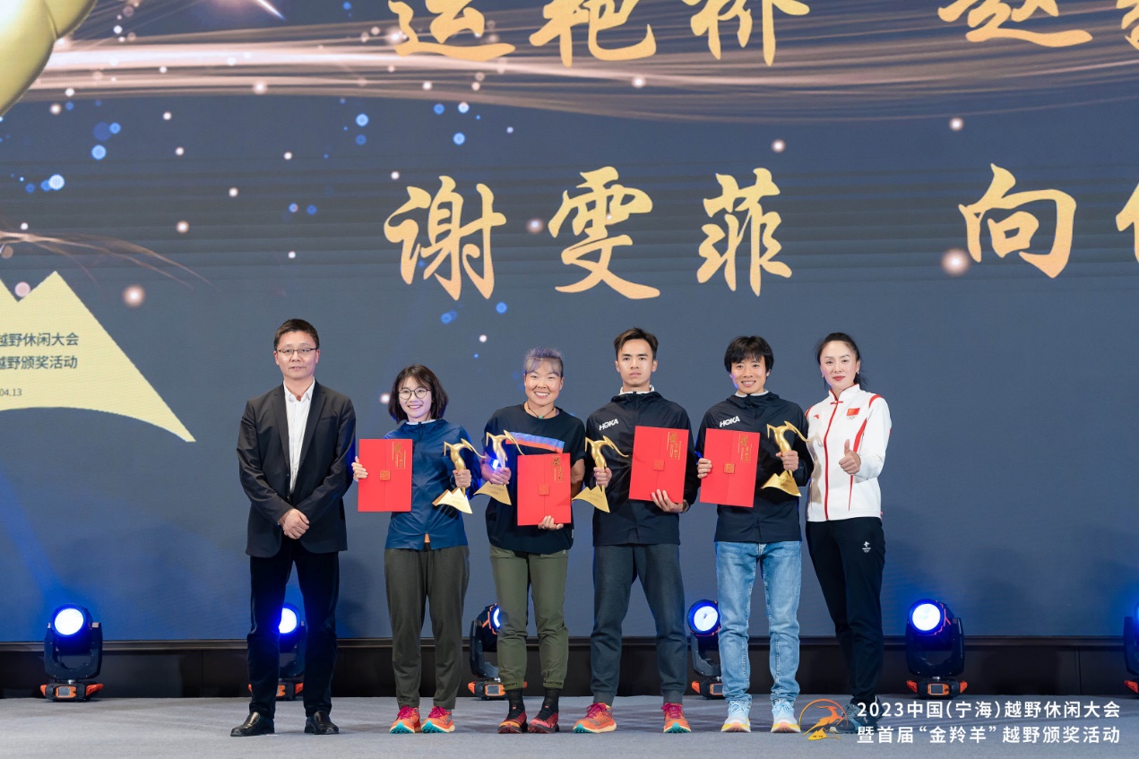 中国社会体育指导员协会会长邱汝、中国奥运首金获得者许海峰为“金羚羊”国际交流奖获得者金飞豹、费宣及UTMB系列赛颁奖
