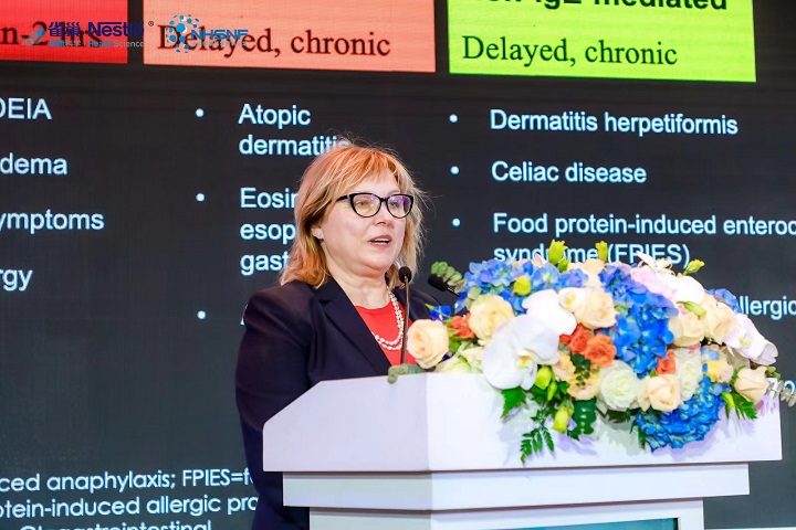 本届论坛涵盖多个儿科营养治疗领域,首先在儿科营养管理及治疗方面需求最广泛的,就是婴幼儿牛奶蛋白过敏(CMPA)。Anna Nowak-Wegrzyn教授及国内外多位专家就婴幼儿牛奶蛋白过敏话题进行了探讨。专家们认为“牛奶蛋白过敏患儿应进行分级诊疗,考虑到大部分对牛奶蛋白过敏的孩子处于轻中度过敏,可使用深度水解配方进行干预,而重度牛奶蛋白过敏可使用氨基酸配方。母乳低聚糖(HMO)作为母乳中第一大免疫活性营养物质,在构建宝宝肠道微生态平衡中起着重要作用。在过敏预防方面,早期引入多种食物过敏原,有助于减少婴幼儿以后未来发生食物过敏的几率。“