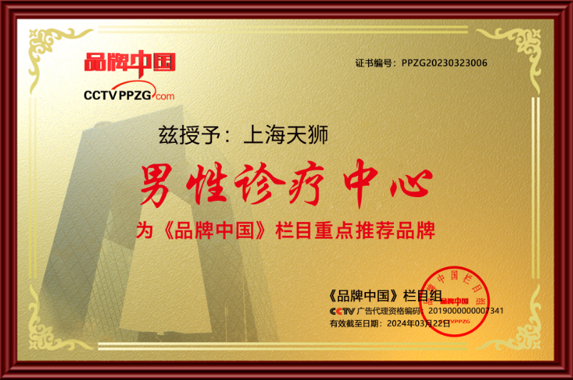 《品牌中国》栏目组发布,上海天狮男性诊疗中心与《品牌中国》栏目组正式达成战略合作并举行签约仪式,授予上海天狮男性诊疗中心“《品牌中国》栏目“重点推荐品牌”称号!本次合作,将充分发挥双方优势,扩大社会影响力,共同搭建优质男性专病平台,落实更好的男性专病解决方案。