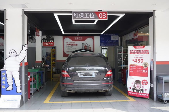天猫养车苏友正德店内,来车络绎不绝但井然有序