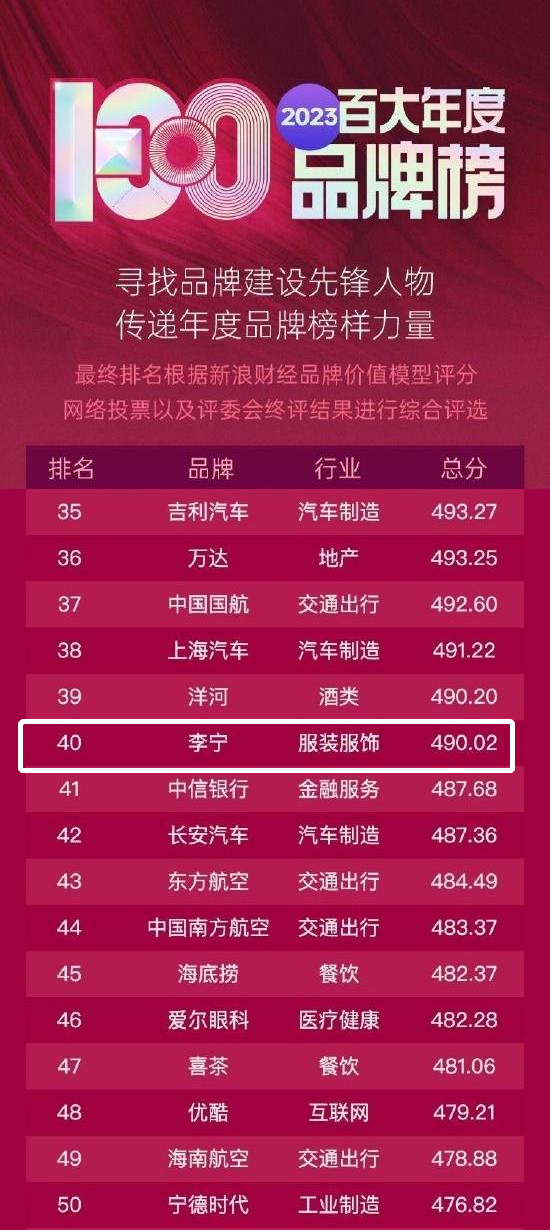 “2023百大年度品牌评选”由新浪财经主办,中国品牌创新实验室、蜜度承办,旨在寻找品牌建设先锋人物,传递年度品牌榜样力量。该评选按照行业划分,根据新浪财经品牌价值模型评分、网络投票以及评委会终评结果进行综合评选。基于新浪财经品牌价值模型评分,李宁品牌在“传播度、美誉度”等维度上有不俗表现,最终位列服装服饰行业赛道榜首。