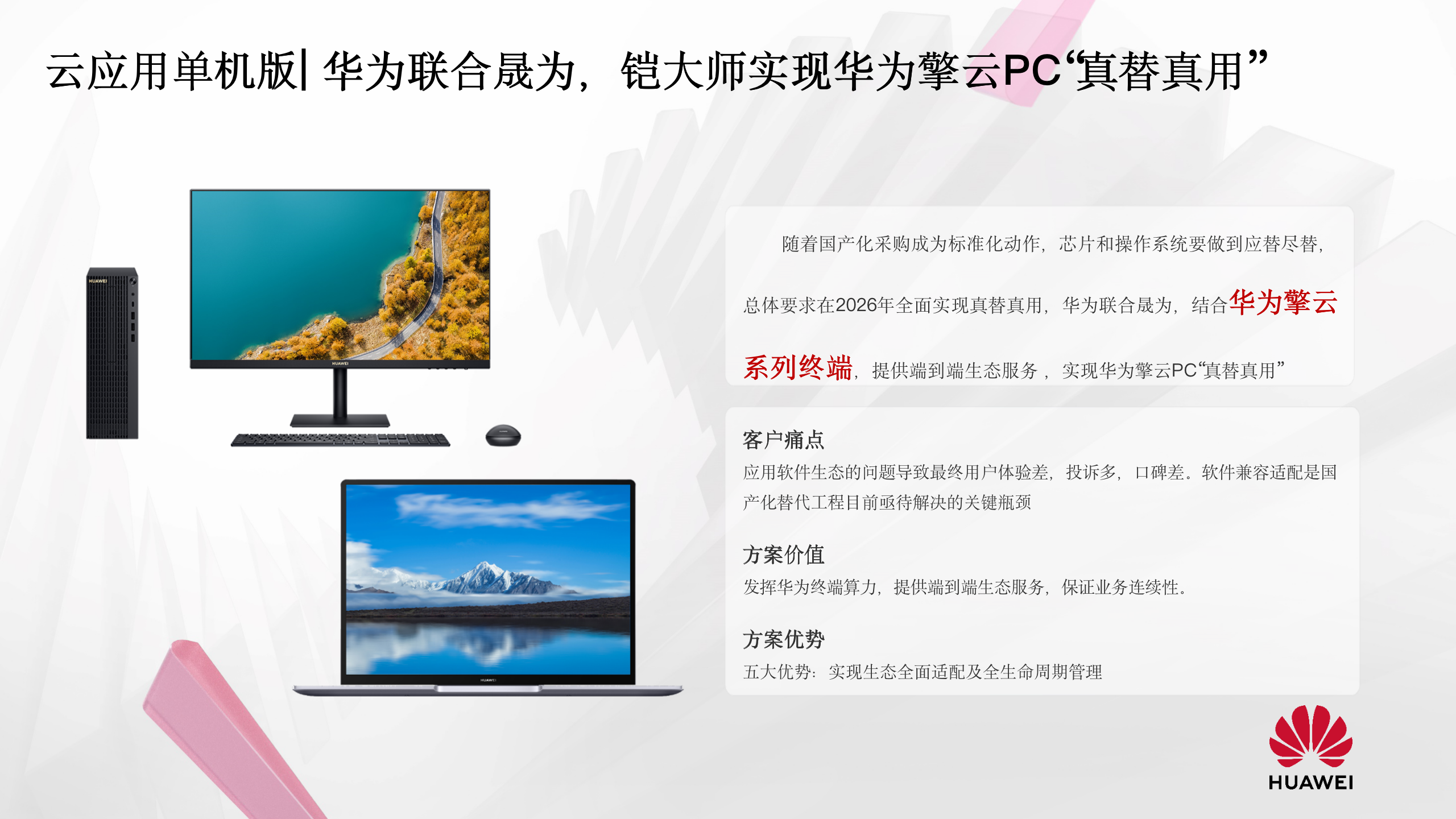 华为始终在聚合信创行业核心力量,深耕用户体验,促进信创 PC 跨越式升级,共筑ARM生态繁荣,实现企业共赢。