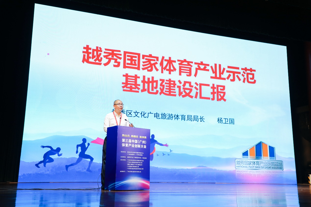 “越秀区有着丰富的、高品质城市公共资源,营商环境不断优化,是创业者和兴业者安居乐业的理想之地。” 越秀区副区长王咏赋在致辞中说道,在国家体育总局体育器材装备中心、广东省体育局、广州市体育局的正确领导和关心支持下,中国(广州)体育产业创新大会此前已成功举办了两届,并取得了一批丰硕成果。“越秀国家体育产业示范基地”正式挂牌、二沙岛智能体育公园落成、一大批在海内外具有影响力的体育企业落户越秀、国内知名体育产业专家组成智库建言献策……极大地彰显了越秀区“老城市新活力”、“出新出彩”,为千年商都核心区的产业升级贡献“越秀模式”。越秀区已在推进体育产业高质量发展方面迈出了新步伐,在推动体育创新发展方面取得了新成效,这必将对区域体育经济发展产生积极的推动作用和示范效应。最后,他代表越秀区表达欢迎,希望大家更多到越秀来,共谋体育产业创新发展的大未来。