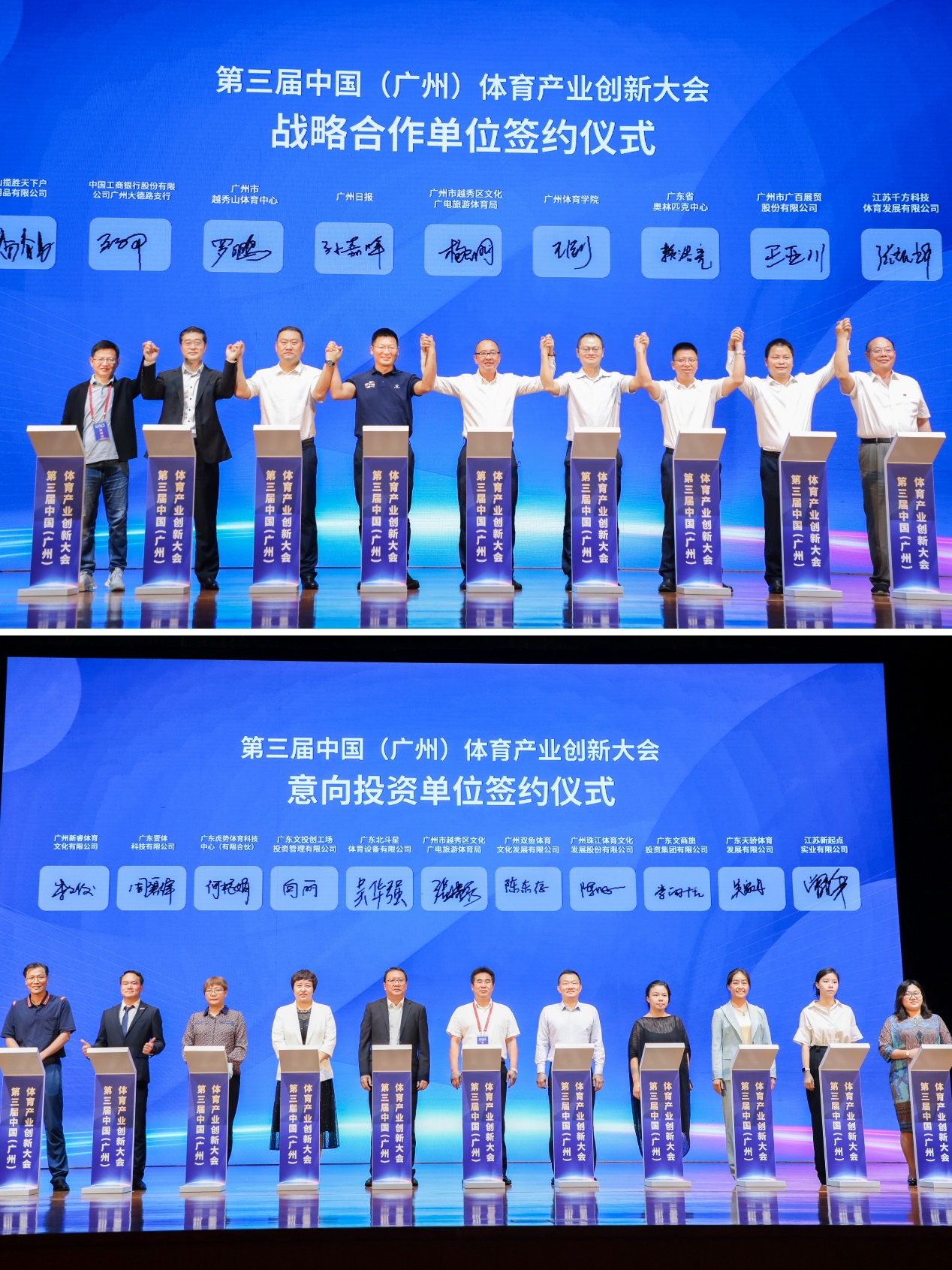通过体育产业创新大会平台的沟通与交流,一些企业、单位达成合作及投资意向,现场举行了签约仪式,广州体育学院,广东省奥林匹克中心,广州市越秀山体育中心,江苏千方科技体育发展有限公司,黄山揽胜天下户外用品有限公司,广州市广百展贸股份有限公司,广州日报社,中国工商银行有限公司广州大德路支行、广州双鱼体育文化发展有限公司、广东北斗星体育设备有限公司、广东壹体科技有限公司等18家企业、单位代表出席了签约仪式,为推动越秀国家体育产业示范基地发展,进一步强化体育产学研深度融合提供强大助力。