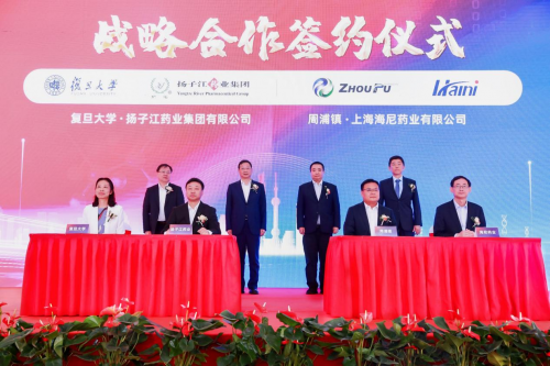 5月21日,扬子江药业集团有限公司与复旦大学,扬子江药业集团上海海尼药业有限公司与浦东新区周浦镇人民政府战略合作签约仪式在上海浦东新区举行。上海市委常委、浦东新区区委书记朱芝松,中国科学院院士、复旦大学校长金力,复旦大学常务副校长许征,上海市浦东新区副区长吴强,上海市浦东新区周浦镇党委书记闵庆峰,扬子江药业集团党委书记、董事长、总经理徐浩宇等领导、嘉宾出席仪式。