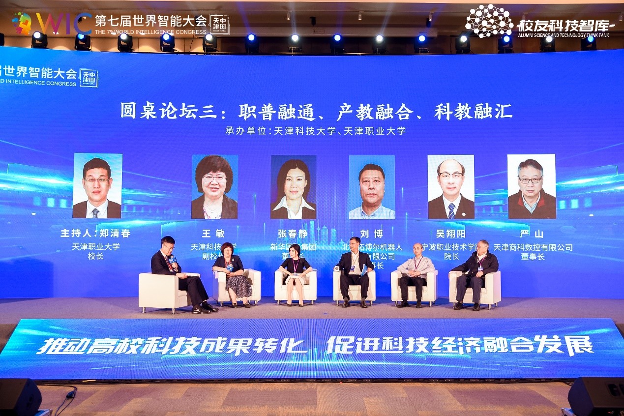 本场圆桌论坛由天津职业大学校长郑清春主持,出席论坛嘉宾有天津科技大学副校长王敏,新华国际集团董事长张春静,北京拓博尔机器人科技有限公司董事长刘博,宁波职业技术学院校长吴翔阳,以及天津商科数控技术股份有限公司董事长严山。本场论坛的主题是:职普融通、产教融合、科教融汇。与会嘉宾围绕中国人工智能产业快速发展背后的人才供给及技术创新问题进行深入的探讨。