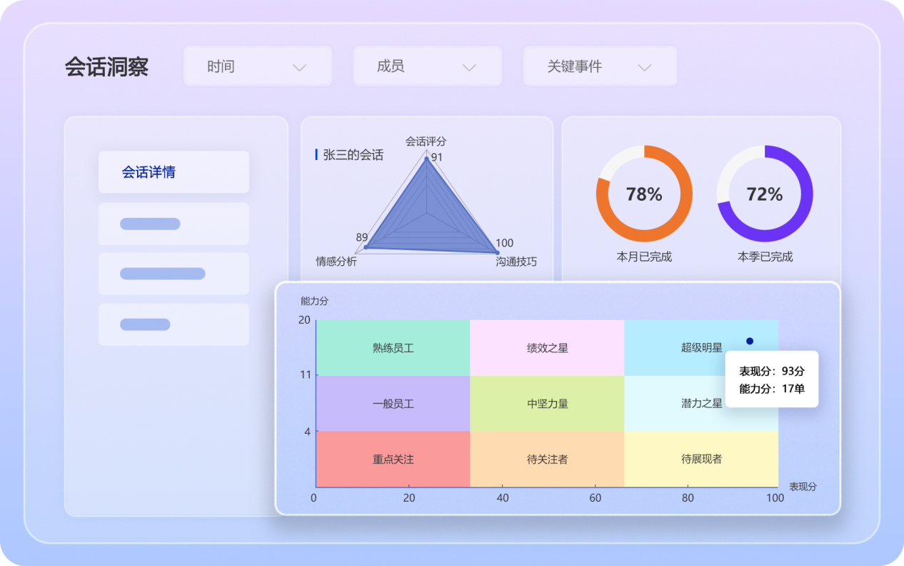 凭借AI销售大脑智能分析,我们为企业提供生成式销售对话训练大模型,以科学、智能的会话分析成功打造金牌销售团队,让优秀的销售能力可复制,全面提升企业销售赢单率。