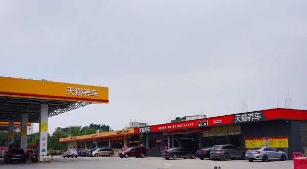 2022年7月,莫伟峰利用广东江人油站的闲置场地,开出了一家900平方米、11个工位的天猫养车门店,构建起他心心念念的“加油-养车-生活”综合服务复合体。