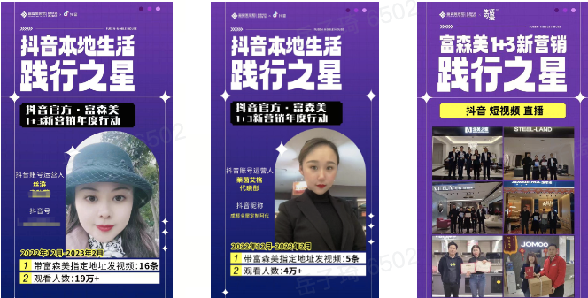除了直播间的优化外,持续地输出优质的短视频内容也是与用户有效沟通的重要方式。作为品牌内容的优质载体,不同视角、不同层级、不同维度的短视频可以有效扩大品牌曝光与影响力,【富森美】通过BGC+PGC+UGC的矩阵化内容组合,直观展现品牌价值,反复强化用户印象。同时,短视频内容还可以结合POI信息,更精准实现本地流量覆盖,有效提升POI热度。