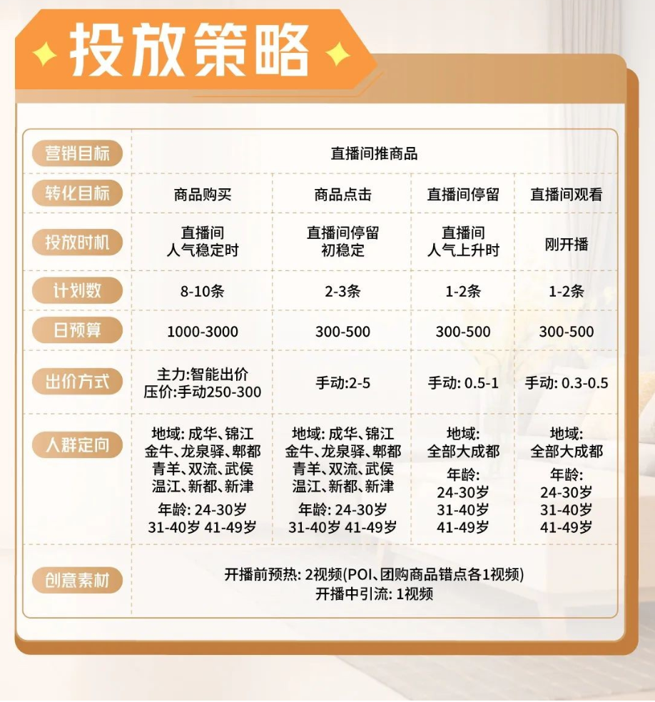 在优化内容,丰富展现的基础上,品牌通过优质的投放推广平台,能够进一步提升营销效能,加速转化效率,打开生意增量。借助巨量本地推,【富森美】通过科学的投放策略,适配的营销产品,高效地达成了营销目标,收获了更直接的转化效果。那么,【富森美】是如何围绕4个关键要素,制定具体地投放策略的呢?