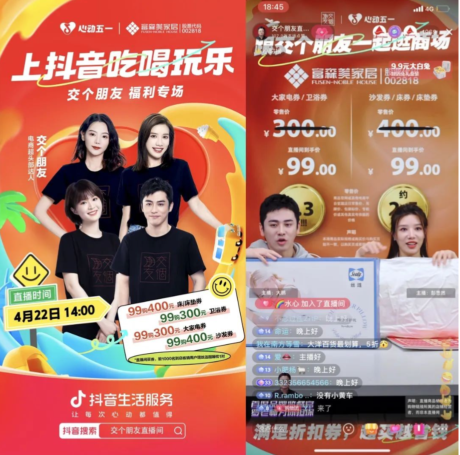 在刚刚过去的五一节日期间,【富森美】就参与了抖音平台的“心动五一”大促活动,借势节日的热度与势能,结合抖音平台专属的优惠政策,快速提升品牌人气。此外,【富森美】还联动了头部达人“交个朋友直播间”,打造了福利专场直播活动,借助头部达人的影响力与专项福利的吸引力,活动有效拉升了团购订单量与整体GMV,用户黏性与好感度也得到了进一步的提升。