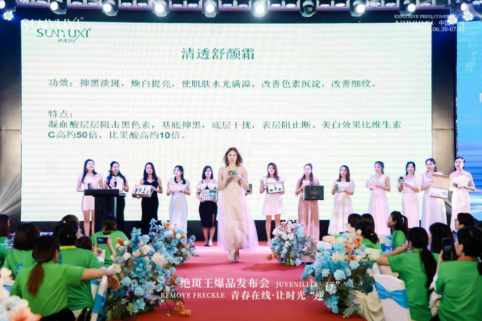 另外,来自全国各地的品牌区域经理纷纷到台上发表战神宣言,旨在凝聚各方力量,提振雨汐家人们的信心,为本次发布会助阵。据相关人员介绍,新推出的绝斑王精准淡斑,淡化顽固性斑点;而炸斑王开展靶向净斑大行动,淡斑成分渗入肌底,并由内而外滋养肌肤。本次发布会以走秀的形式呈现多款产品,见证最美产品,将最具代表性的产品展现给现场的观众。
