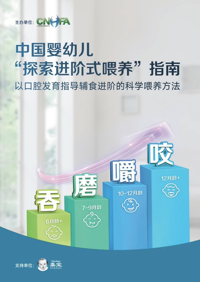 为了给婴幼儿更好的辅食选择,全球知名的婴幼儿辅食品牌嘉宝一直持续关注着妈妈们在辅食喂养过程的问题。嘉宝通过多年研究与大量一手消费者调研发现,遵循婴幼儿从出生的反射性吸吮到有意识的小口吞咽、碾磨、咀嚼和大口咬的口腔发育水平,添加相适应辅食,使用相适应方式进行的喂养方法,不断地进阶发展,可以逐步完成婴幼儿辅食添加从液体、半固体、固体,直至过渡到完全的成人饮食模式。这些研究和调研结果,为中国营养保健食品协会撰写该《指南》提供了部分思路与理论支持。