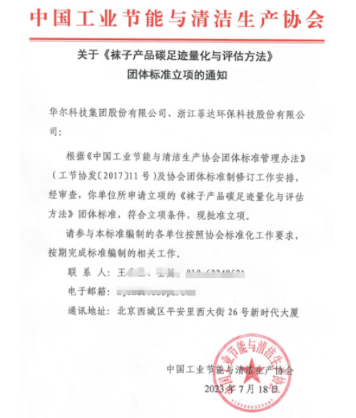 图:华尔科技《袜子产品碳足迹量化与评估方法》获得国家立项