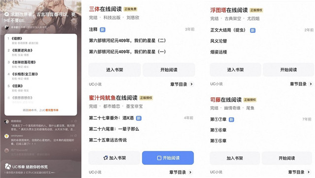 在UC浏览器,可以又快又准地搜到,海量丰富的小说资源都能免费看正版。玄幻、都市、言情、历史、科幻等各种题材的小说,都可以在UC浏览器搜得到,不管你是爱看爽文解压的打工人,还是追甜文磕CP的主妇,都可以在UC找到对味的小说。此外,在UC还可以看各类热播剧的正版原著小说,如爆款剧《长相思》《以爱为营》《莲花楼》《南风知我意》《三体》《亲爱的热爱的》《司藤》等,都能满足追剧党一边追剧一边刷原著的需求。
