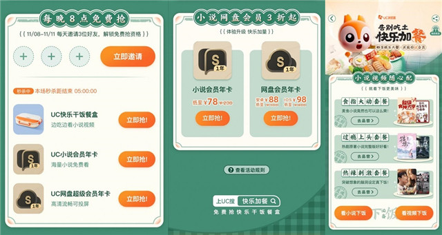 更有惊喜福利快乐加码,11.8-11.11上UC搜“快乐加餐”,邀请好友获取抽奖机会,每晚20点即可免费抢UC小说、UC网盘全年会员和限量快乐干饭餐盒。