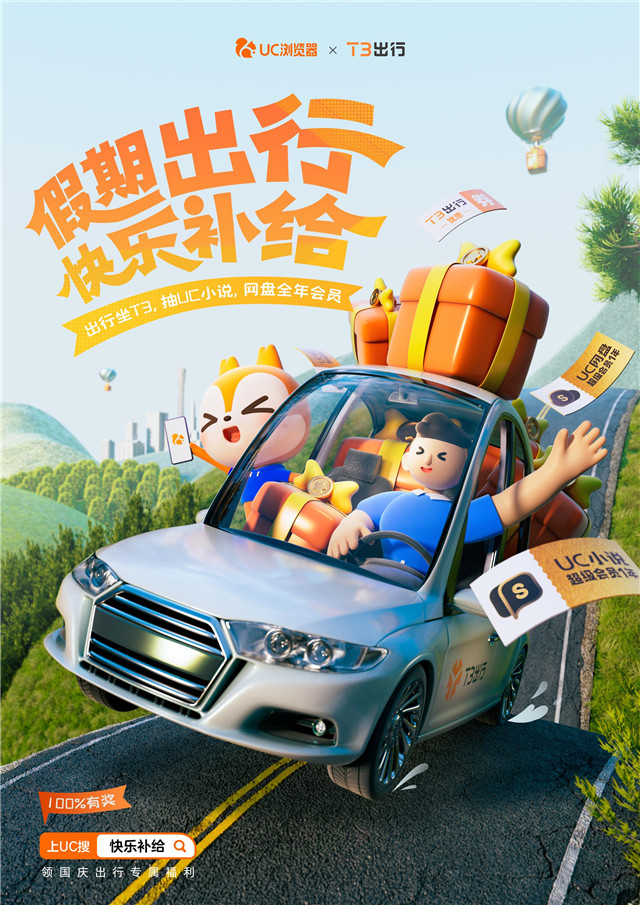 今年中秋国庆双节之时,UC浏览器就洞察到用户的出行痛点,联合T3出行,用丰富好用的小说、播放器、网盘功能,搭配T3出行大额出行券包,还用有趣实用的出行实物装备,让用户在假期的排队堵车焦躁等待时间、内存不足的焦虑时刻,用海量小说一键畅听、精彩视频流畅播放、超大内存自动备份的好用功能,实现愉快出游。