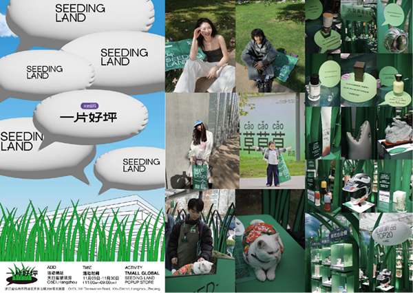 以杭州为例,天目里“一片好评”天猫国际创新IP种草箱快闪体验店,使用实物的真正好草打造具象的一片好“坪”,各大品牌所在的“种草”子单元,通过与用户的互动体验,带来惊喜的种草感和极强的话题性,推动自发宣传声浪在社交渠道的裂变式传播。