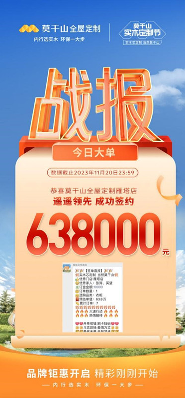 一个好的营销活动不仅能够吸引消费者的注意力,更能传递品牌的核心价值,传播品牌理念。而在11月,莫干山家居就给全国消费者带来了一场关于健康、环保、人文的营销盛宴。据统计,莫干山实木定制节全国门店订单总量超额完成目标,线上线下亿级曝光、大单频出、全国联动,这是一场在行业内引发现象级效应的营销盛宴,莫干山实木定制节的圆满收官,再一次证明了其品牌影响力之广和品牌综合实力之强。