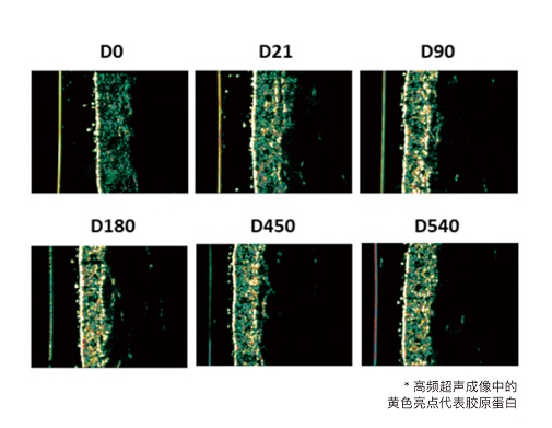 高频超声影像显示,在ART FILLER VOLUME艺术填充·致塑治疗前至治疗后540天,18个月持续促进胶原蛋白新生,有效增加软组织致密度,为面部提供透明质酸凝胶和再生胶原蛋白的双重支撑[4]。