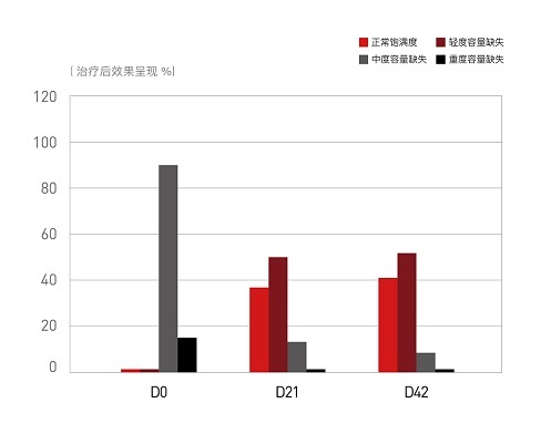 ART FILLER VOLUME艺术填充·致塑注射后即刻效果突出,随胶原健康再生而改善周围组织的容量缺失,增加临床效果维持时间,面部容量评级显示在注射后中重度容量缺失逐渐转变为轻度或无容量缺失[5]。上述内容都为艺术填充·致塑在恢复中面部体积的临床治疗效果的短期及长期有效性方面提供了有利证据。