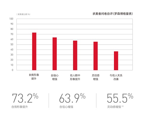 只有了解求美者的真实需求,才能更好地满足他们的期望,通过大量的市场调研、用户反馈,才能有针对性地提供个性化的解决方案。对此,FILLMED菲欧曼针对使用ART FILLER艺术填充的术后患者进行了一场自尊度评价和主观评价调查,并用已刊登在《国际美容及抗衰老医学杂志》的罗森博格量表进行分数评估:在治疗1个月后,有73.2%的受试者认为自我形象改善,有63.9.2%的受试者认为自信心增强、还有55.5%的受试者认为灵动感增强,皮肤质量和面部外观都有明显改善,同时在大样本量的支持下(889份),GAIS评分显示98.5%的求美者对治疗效果满意[6] 。