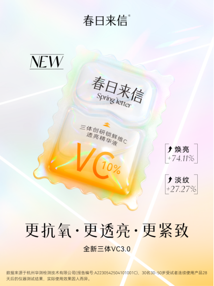 春日来信凭借深研VC护肤的理念、创新科研技术,走在中国VC护肤领域的前沿。明星产品三体VC2.0精华全网累计热卖1亿+片,荣获美丽修行国货之光等多个奖项。结合春日来信研发实验室的不断科研探索,筛选原料、大量的基础研究工作,全新第3代三体VC精华3月4日带着使命卷土重来。