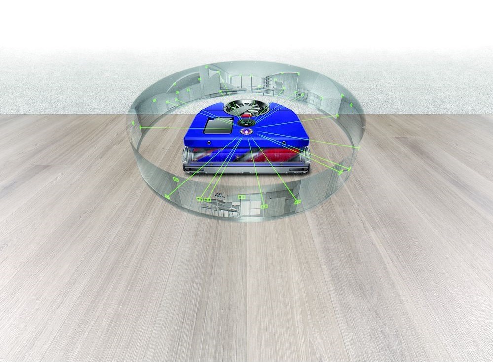 戴森吸尘机器人配备的360°智能导航,采用戴森独特的即时定位与地图构建系统(SLAM),搭载26个传感器,能够持续分析周围环境,顶部配备的8个LED光源会在低亮度条件下主动打开,黑暗环境下,也能帮助识别周围环境,“找到”需要清洁的区域和“记住”已清洁的区域,并在清洁过程中避开障碍物和无需清洁区域。其搭载的压电式传感器以每秒15,000次的频率监测灰尘浓度,并指导机器按需自动调节吸力[5]。
