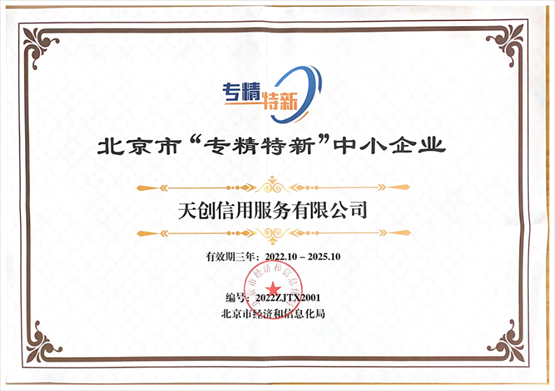 作为北京市“专精特新”中小企业,天创信用具备深厚的创新技术实力,2015年便获得央行企业征信备案资质,不仅是发改委27家首批综合信用服务试点机构之一,还是国家高新技术企业和公安部信息安全三级等保企业。